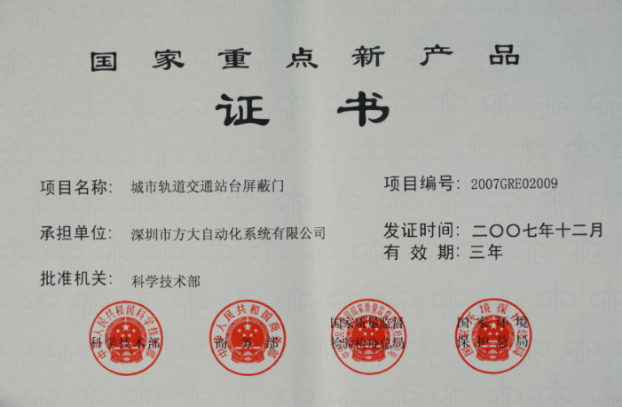 Our "Platform Screen Door System for Rail Transit" project was rated as "National Torch Plan Industrialization Demonstration Project" by the Ministry of Science and Technology of the People's Republic of China.